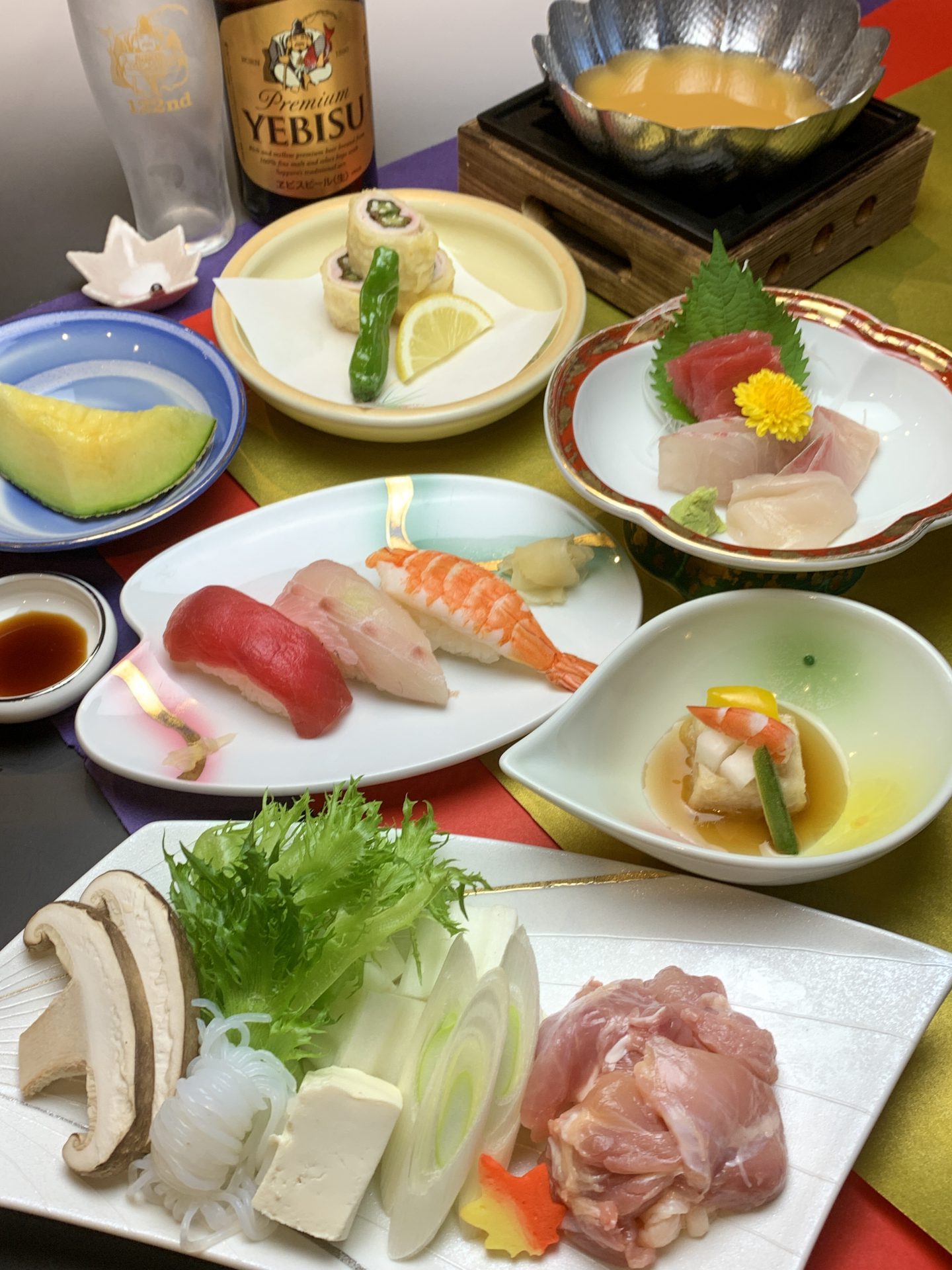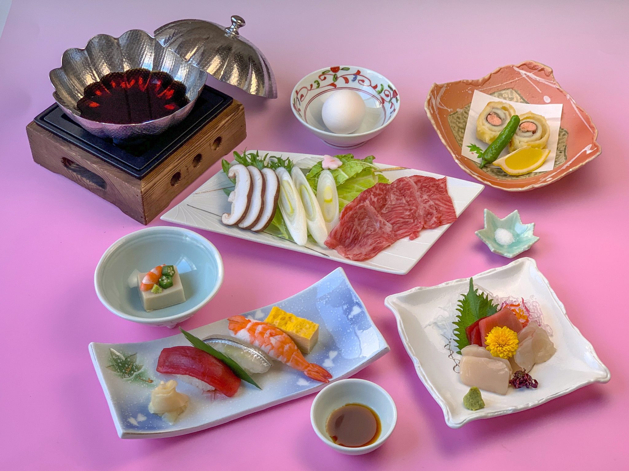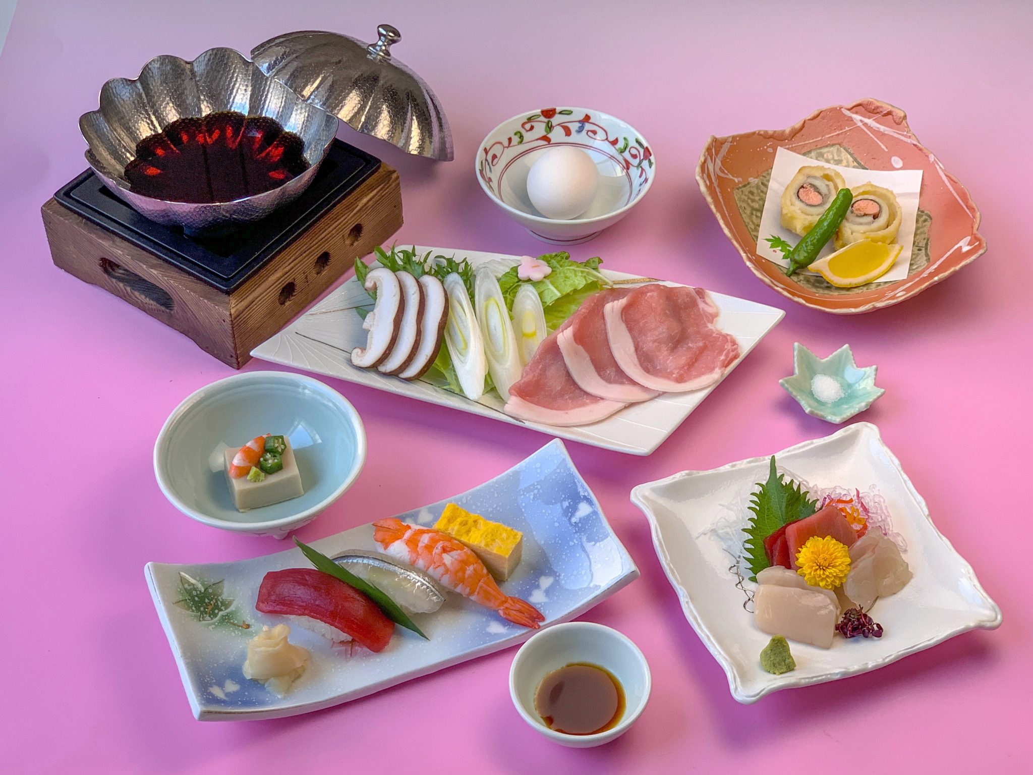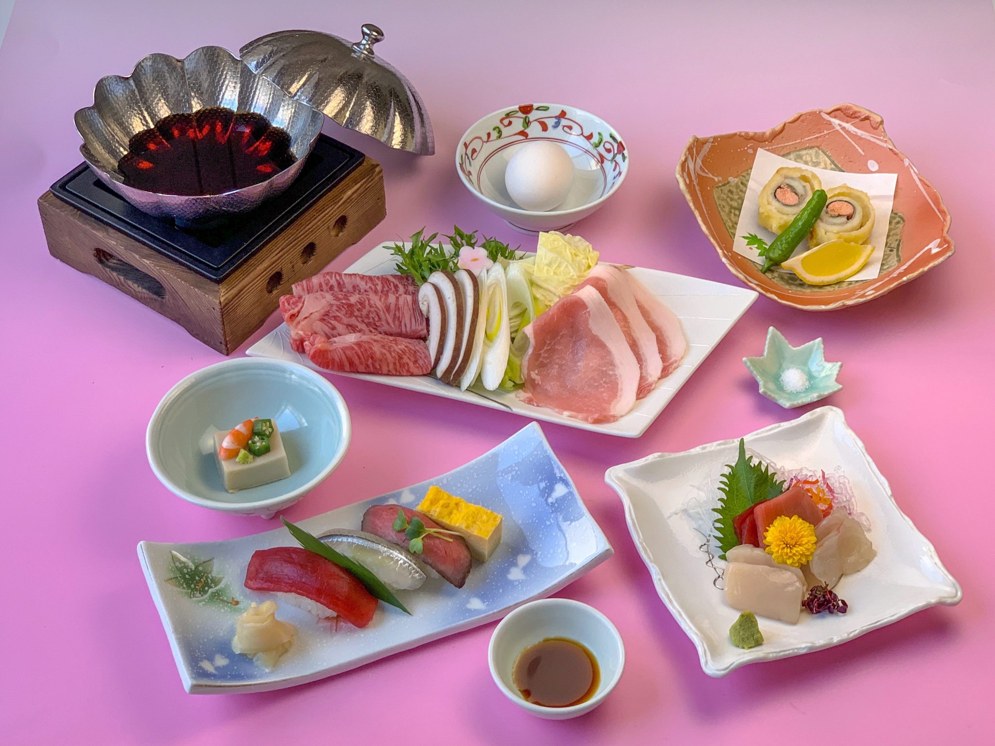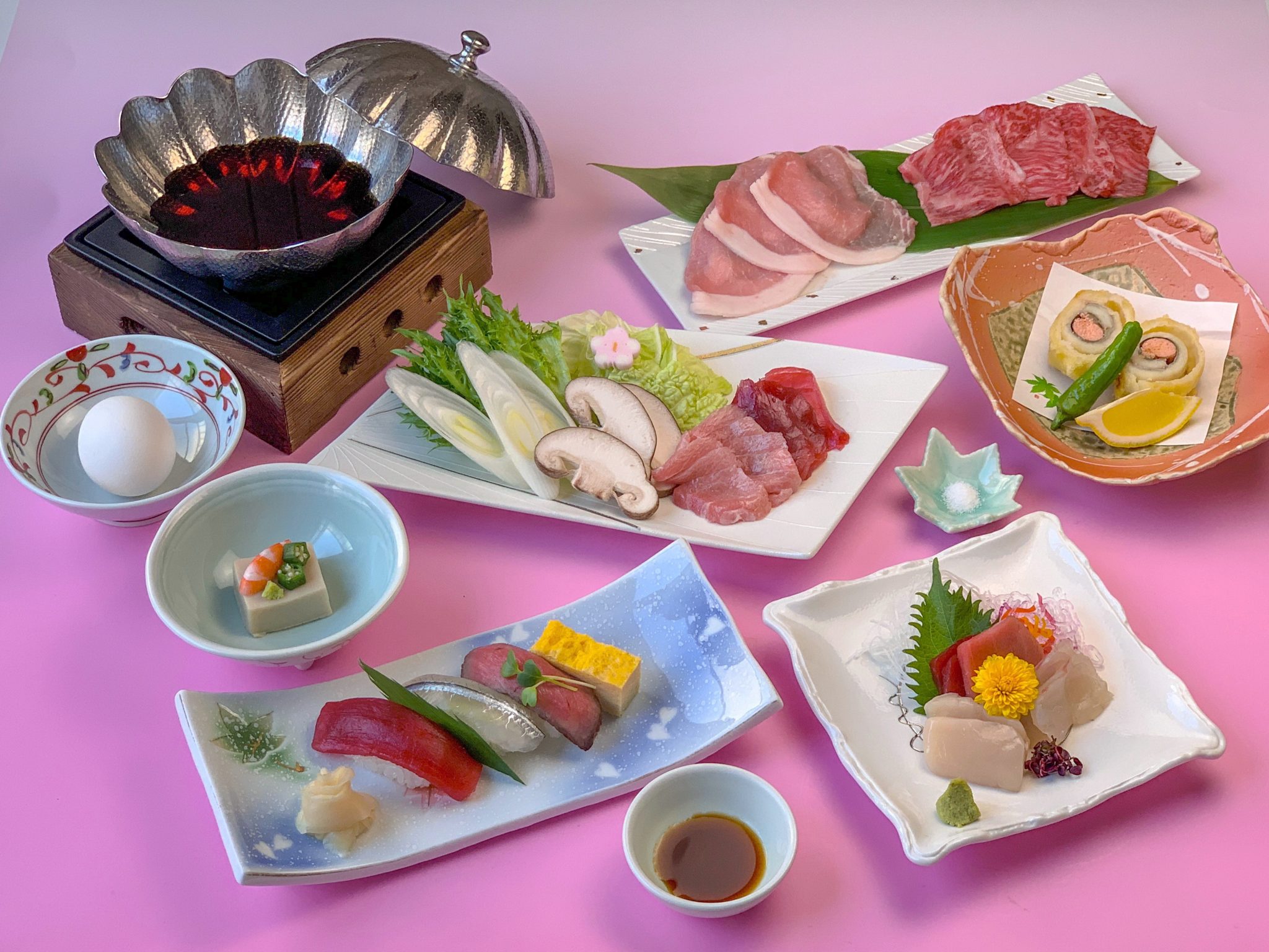 鮪と黒毛和牛と静岡県産ブランド豚「ふじのくに」を使用した「すきしゃぶコース」です...